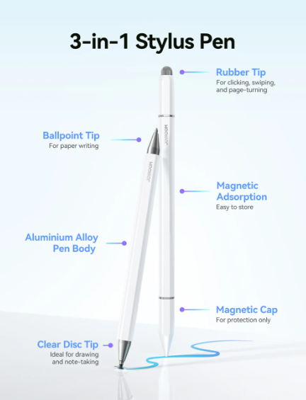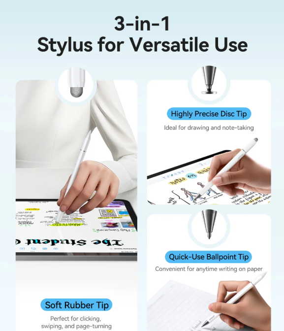 - 【3 in 1 Functionality】 Features interchangeable tips for touchscreen use, suction cup precision, and traditional ballpoint writing