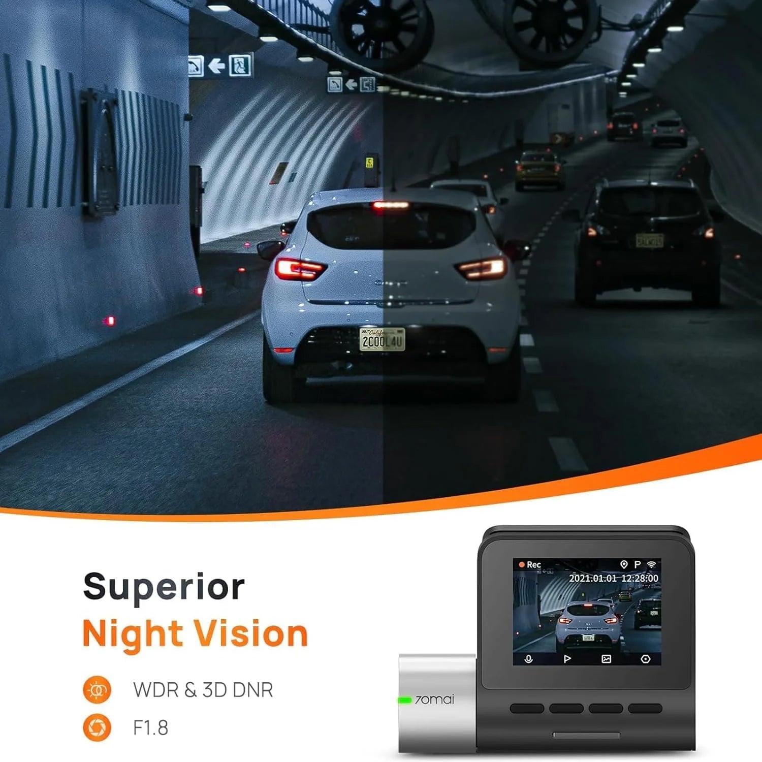 Features a 140° wide-angle lens and F/1.8 aperture, reducing blind spots while capturing more of the road. The 6-layer glass lens enhances brightness, clarity, and color accuracy. -